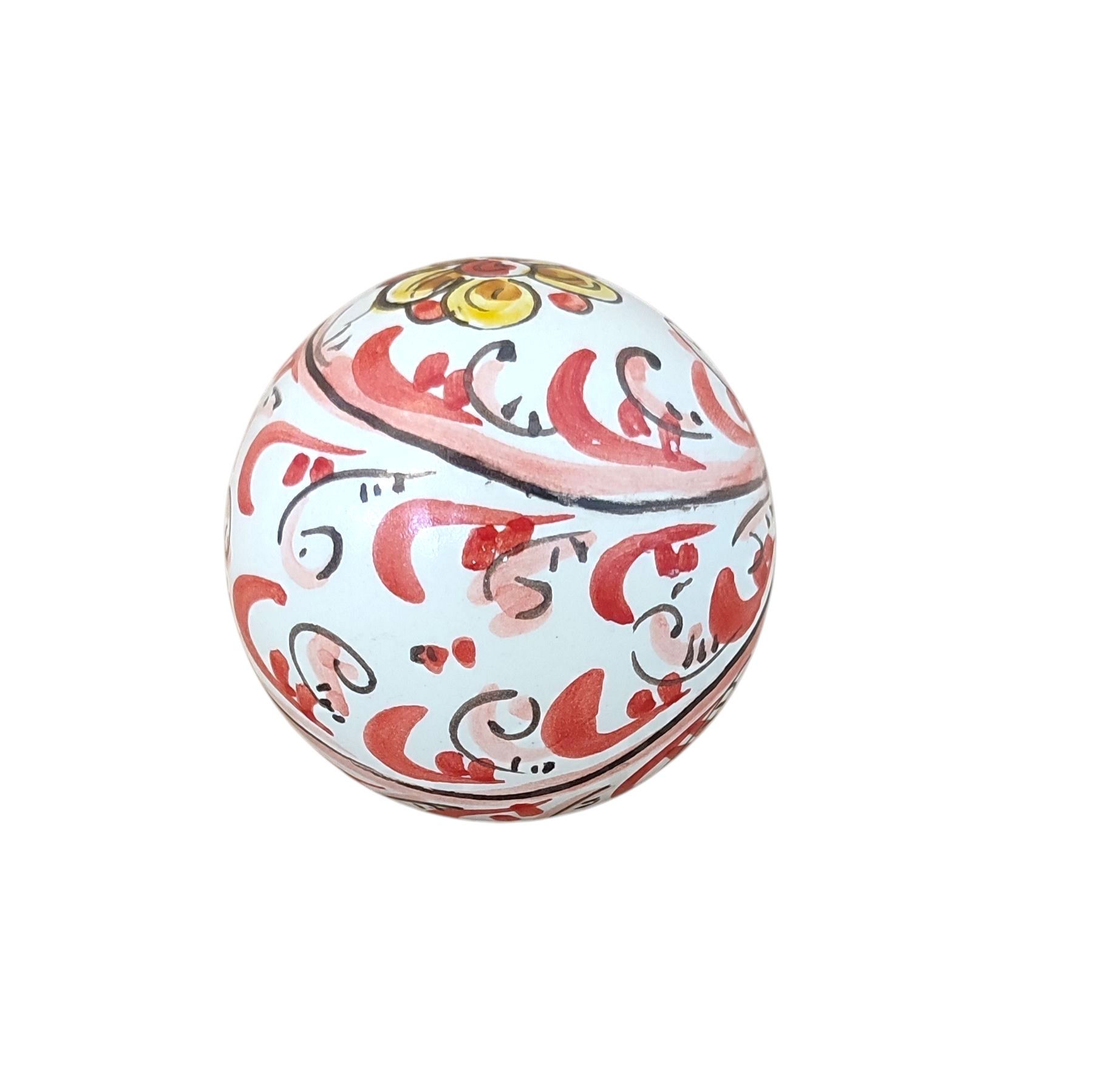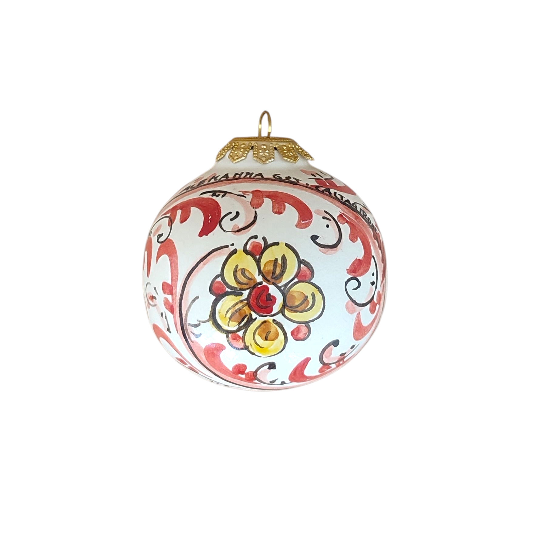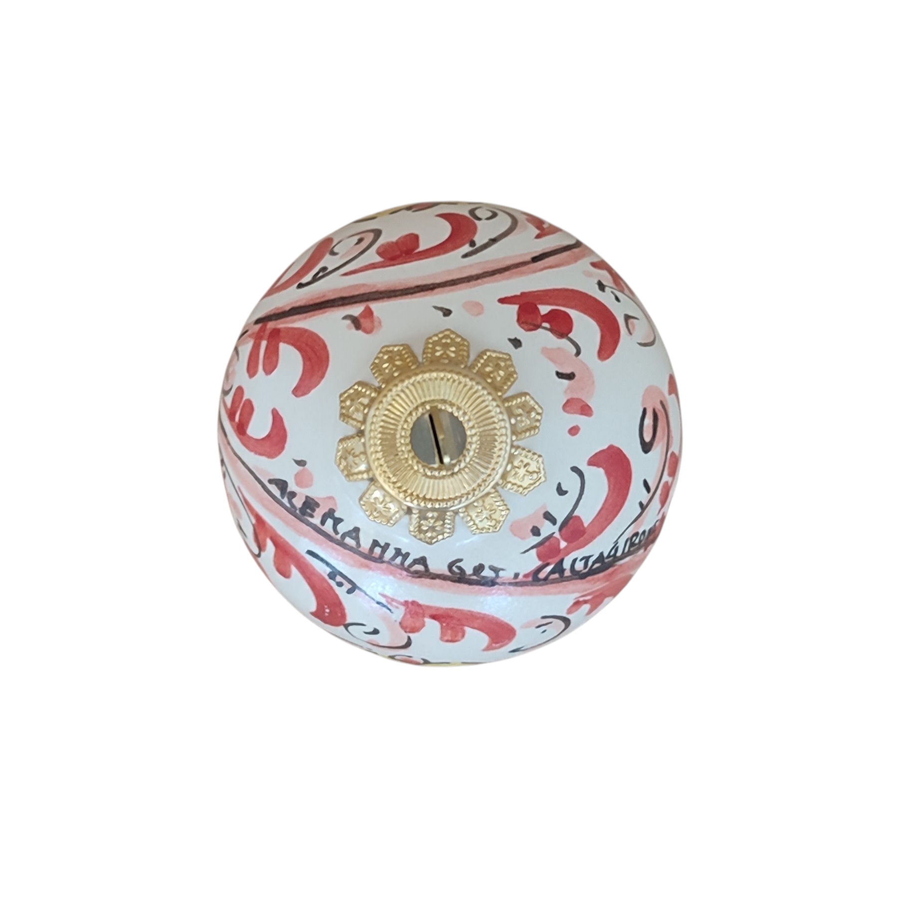 Pallina di Natale dipinta a mano in Ceramica di Caltagirone diametro 8 cm. Dipinta a mano dai Maestri Giorgio e Ivano Alemanna nel proprio Laboratorio di Caltagirone. Se ne certifica autenticità.