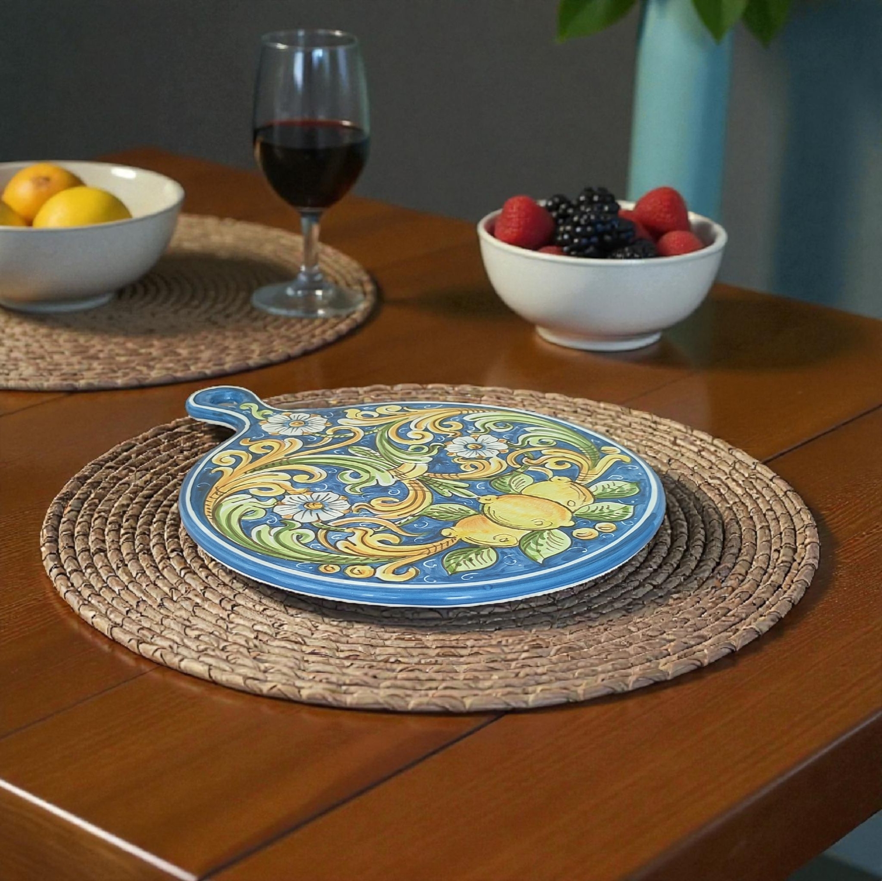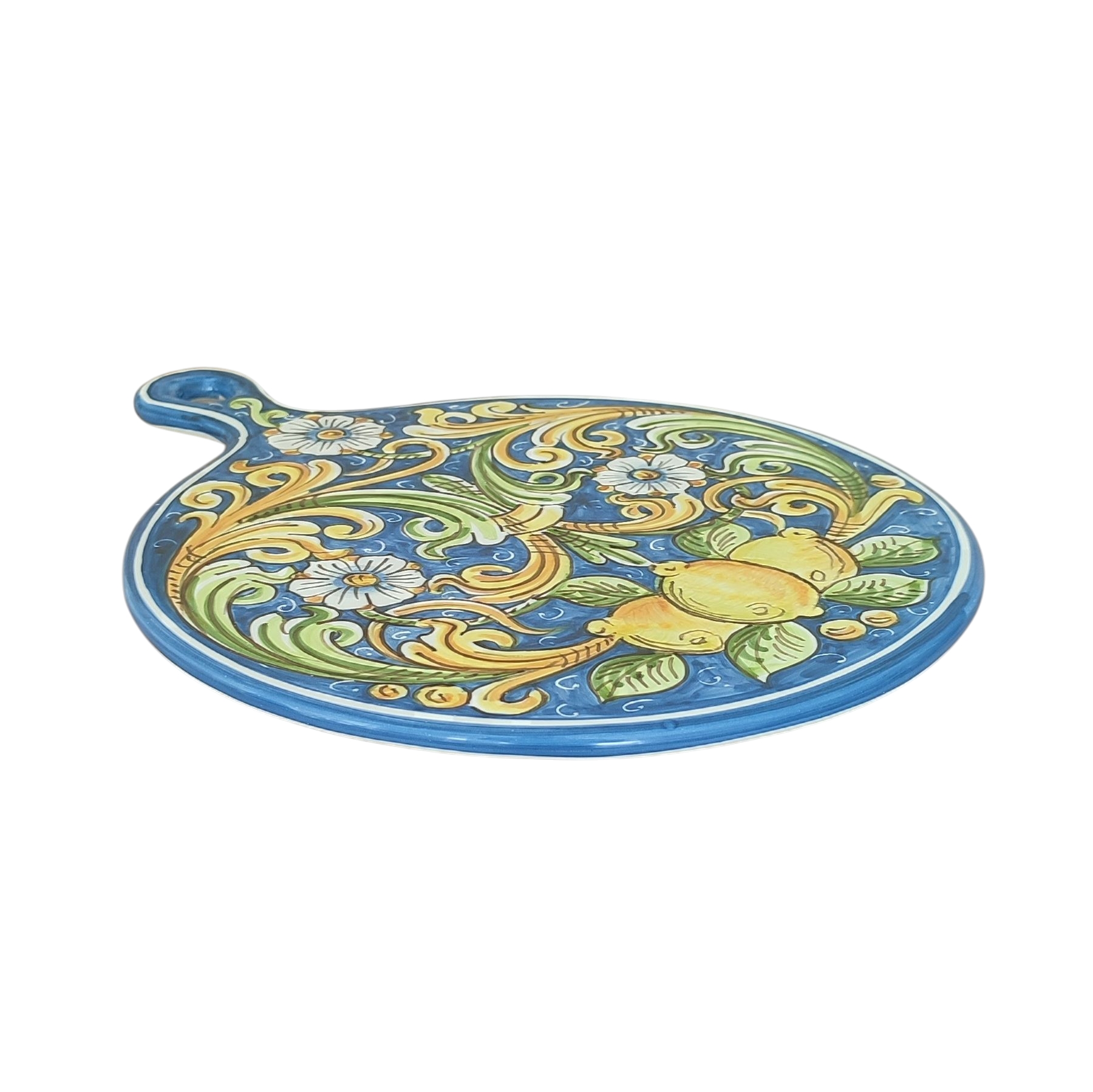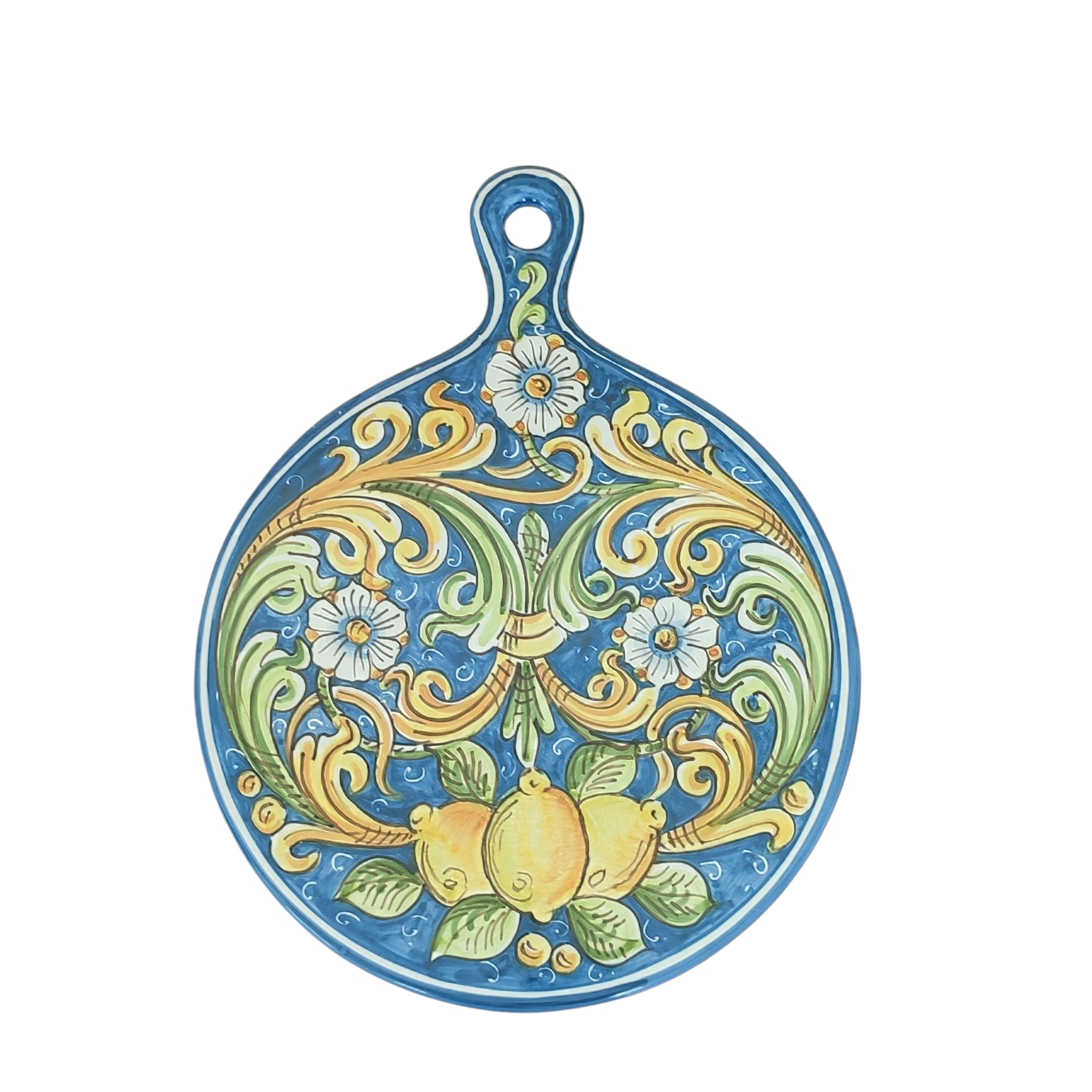Tagliere tondo in ceramica di Caltagirone decorato interamente e amano con decorazione Ornato Calatino, che fa parte della Tradizione Ceramica di Caltagirone, risalente al periodo Settecentesco e caratterizzato dalle grandi volute intagliate con il manganese e completate con i colori del giallo e dell’arancio su fondo blu o verde. Questo decoro, riprende i motivi tardo barocchi che adornano le volte ed i soffitti delle numerose chiese dell’epoca esistenti su Caltagirone.